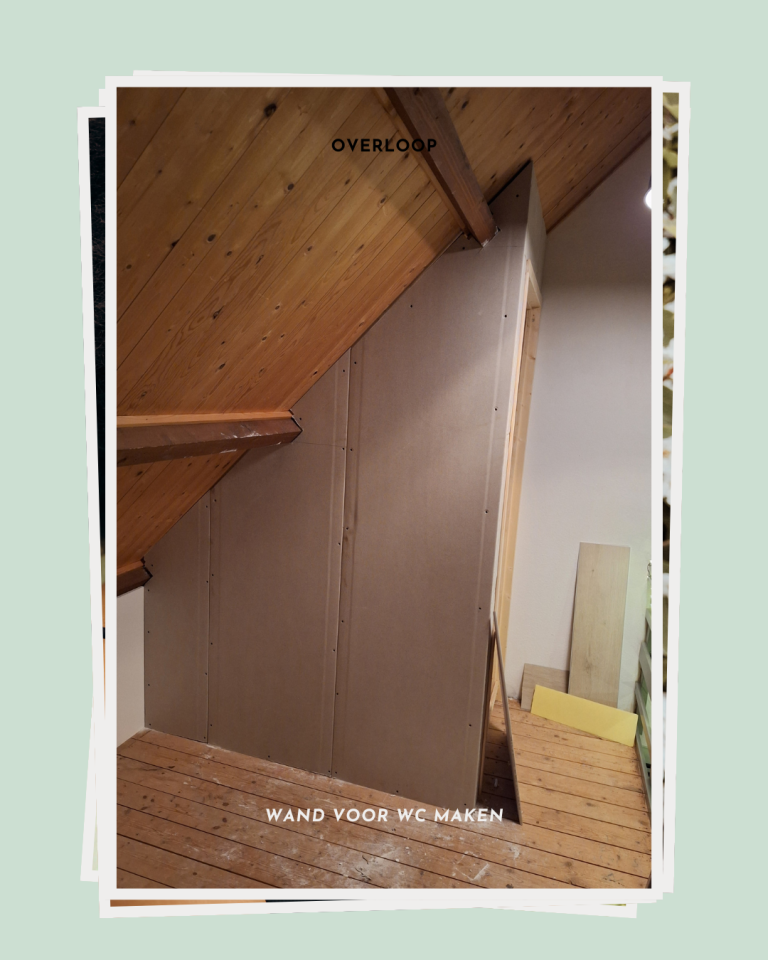 We plaatsten een nieuwe wand op de overloop om een WC te kunnen maken met een kleine wasbak. Deze WC zal in deze fase van de verbouwing nog niet af zijn. Hiervoor moet buiten eerst het leidingwerk worden aangepakt.