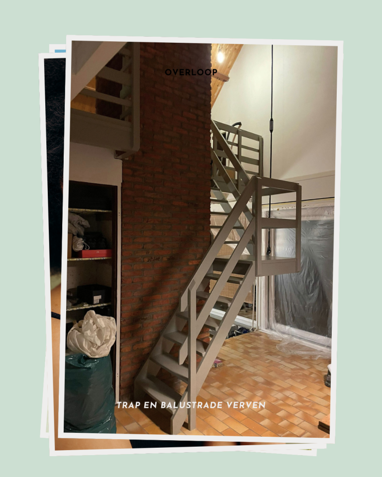 De trap en balustrade werden geschuurd en geverfd. Met een frisse laag verf veranderde het van een standaard doorgang in een stijlvolle verbinding tussen de verdiepingen.