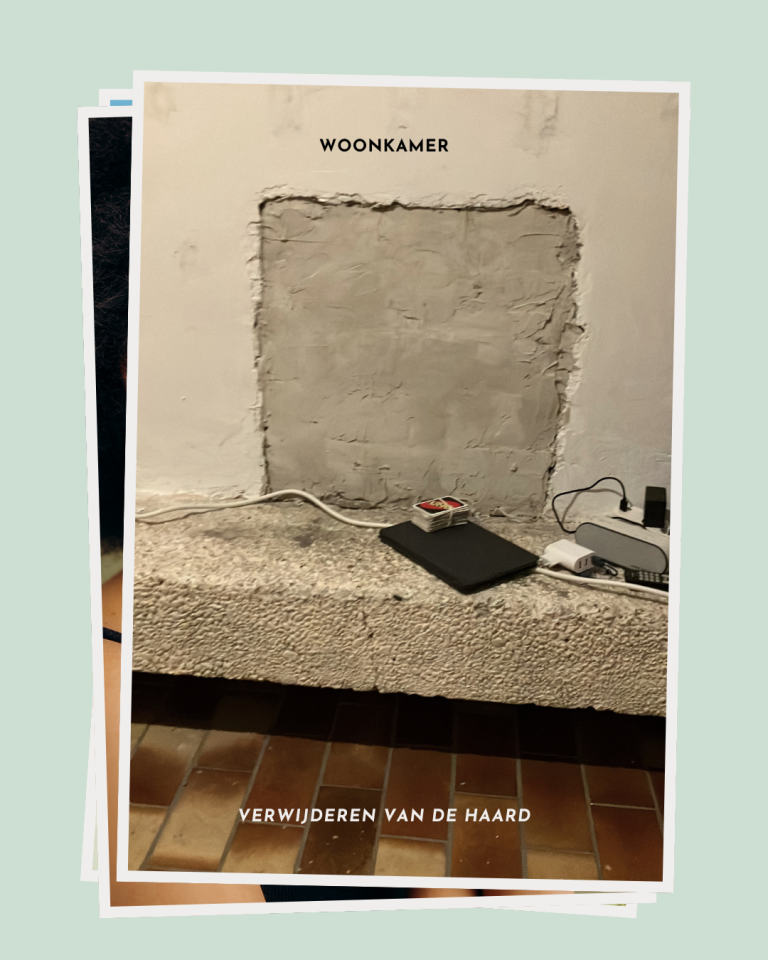 De oude haard werd verwijderd om de ruimte rustiger en moderner te maken. Zo ontstond een neutrale basis voor de rest van de opfriswerkzaamheden.