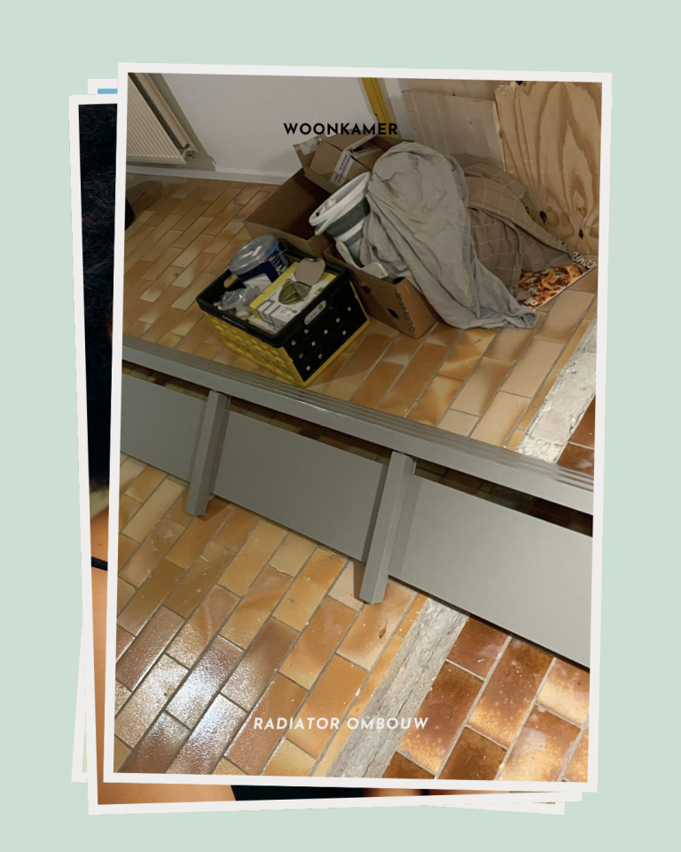 De bestaande radiatorombouw kreeg een frisse verflaag en werd stevig gemaakt, zodat hij zowel functioneel als mooi blijft in de vernieuwde woonkamer.