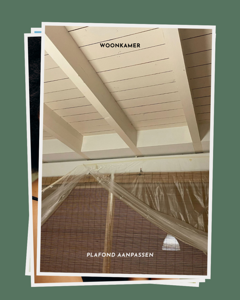 Het plafond werd gedeeltelijk aangepast. Er kwamen gordijnkoven en we denken na over het isoleren van het plafond van de woonkamer, voor extra comfort en een strakke afwerking.