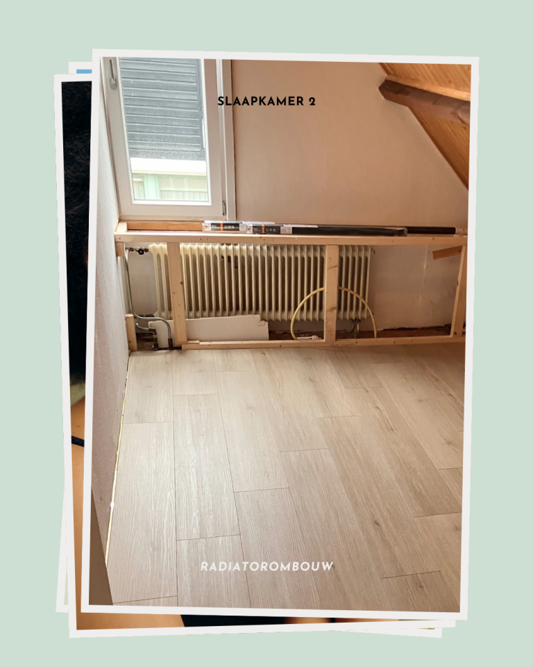 De grote radiator lieten we zitten, maar maakten er een slimme ombouw omheen. Deze ombouw dient als vensterbank, boekenplank én nachtkastje – praktisch én stijlvol.